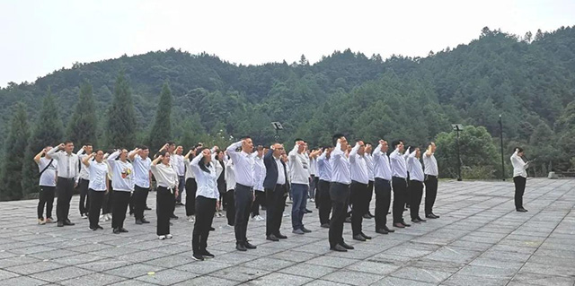 在道吾山風景名勝區內,瀏陽烈士陵園被群山環抱,烈士紀念碑巍巍矗立。瀏發集團全體黨員面對莊嚴的紀念碑,懷著沉重的心情,默哀并行三鞠躬禮。集團黨委書記、董事長張伯鋒,黨委副書記、總經理王輝章代表瀏發集團向英烈敬獻花籃,并整理花籃上的緞帶。